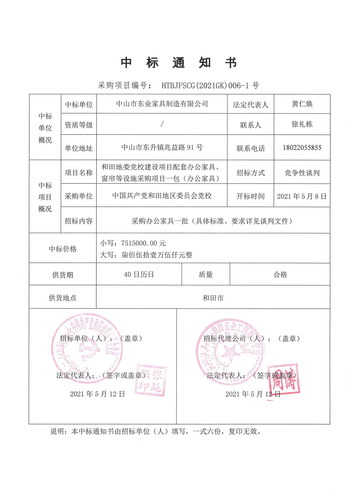 Xinjiang Hotan District Party School Construction Project - Supporting Office Furniture - Window and Other Facilities Procurement Project 7.515 million yuan