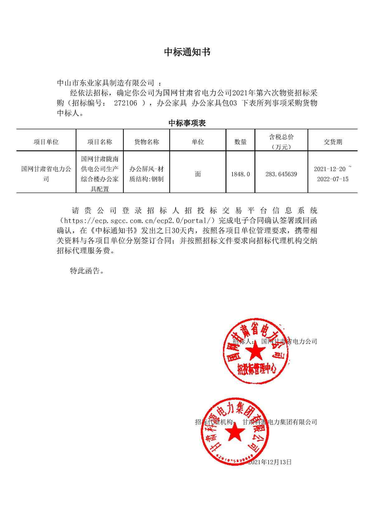 State Grid Gansu Longnan Power Supply Company Production Comprehensive Building Office Furniture Configuration Project 2.8365 million yuan